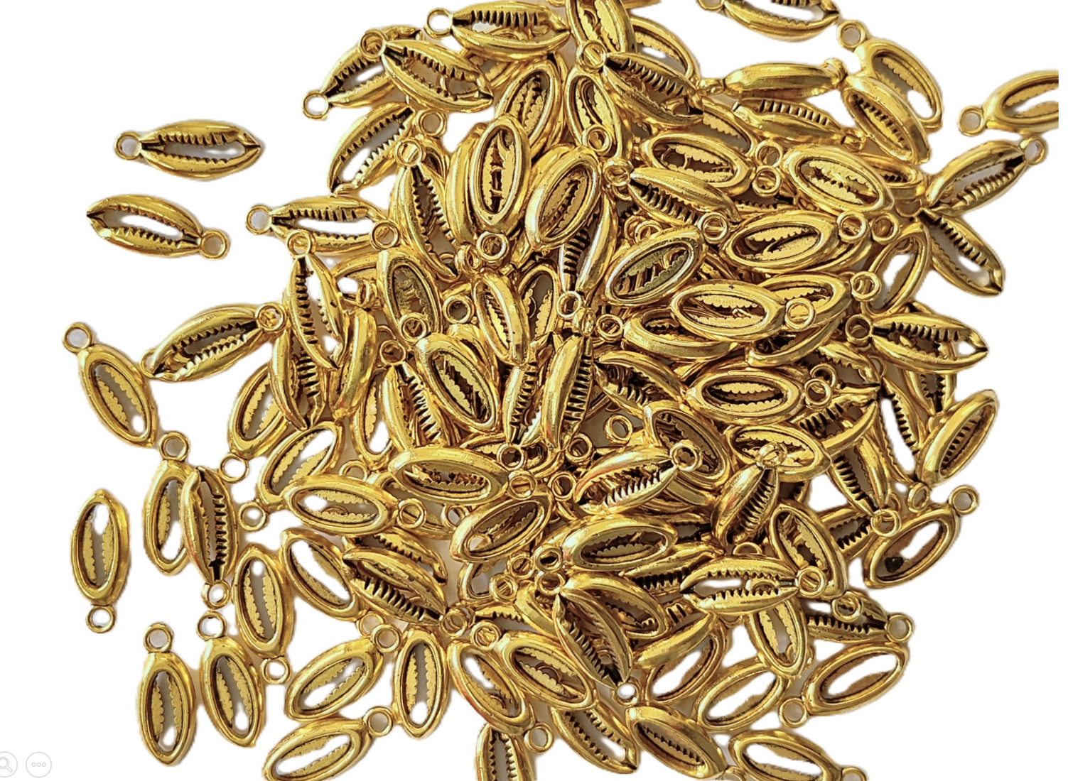 Golden colour artificial kodi/Kowdi/Cowrie with ring for Rakhi making, Jewellery making, friendship band, spacer,bracelet, art and craft work, cloth design embroidery work, chain, jewellery work and other design work. Total 200 pieces, size 16×7 mm