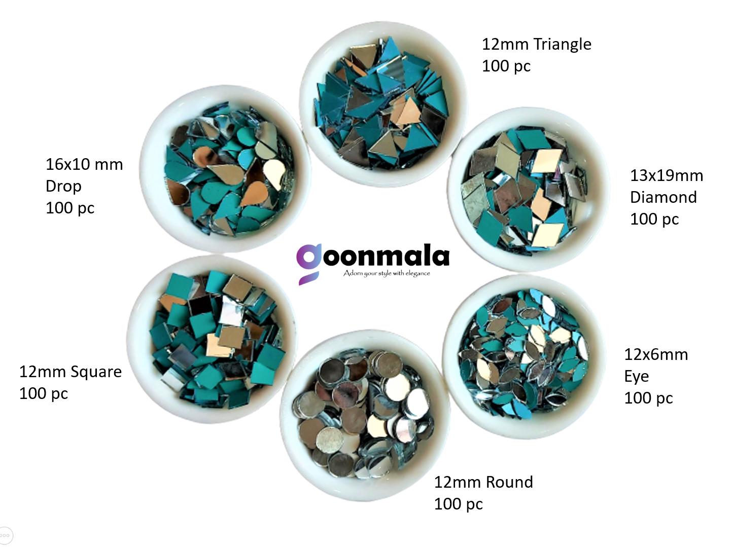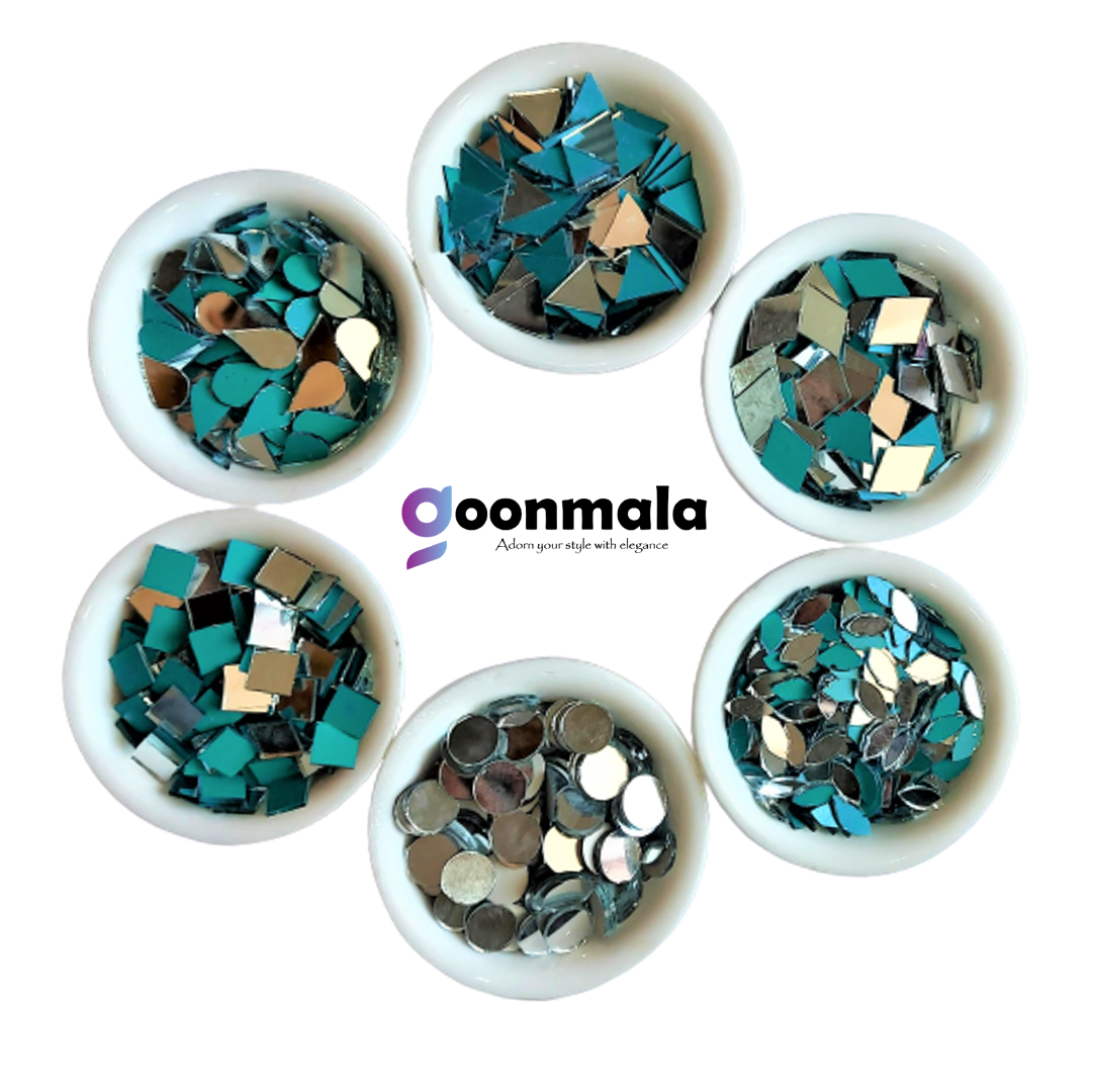 Mirror beads in designer shapes for jewellery making lippan art and other art and craft work. Goonmala provide extra pieces for in case of damages, each pieces manually selected. Colour: Silver,6 shape small Mirror- Round 12mm, Eye 6x12mm, Drop 10x16mm, Triangle 12mm, Square 12mm, Burfi 13x19mm, 100pieces each Total 600 pieces with Fabric Glue