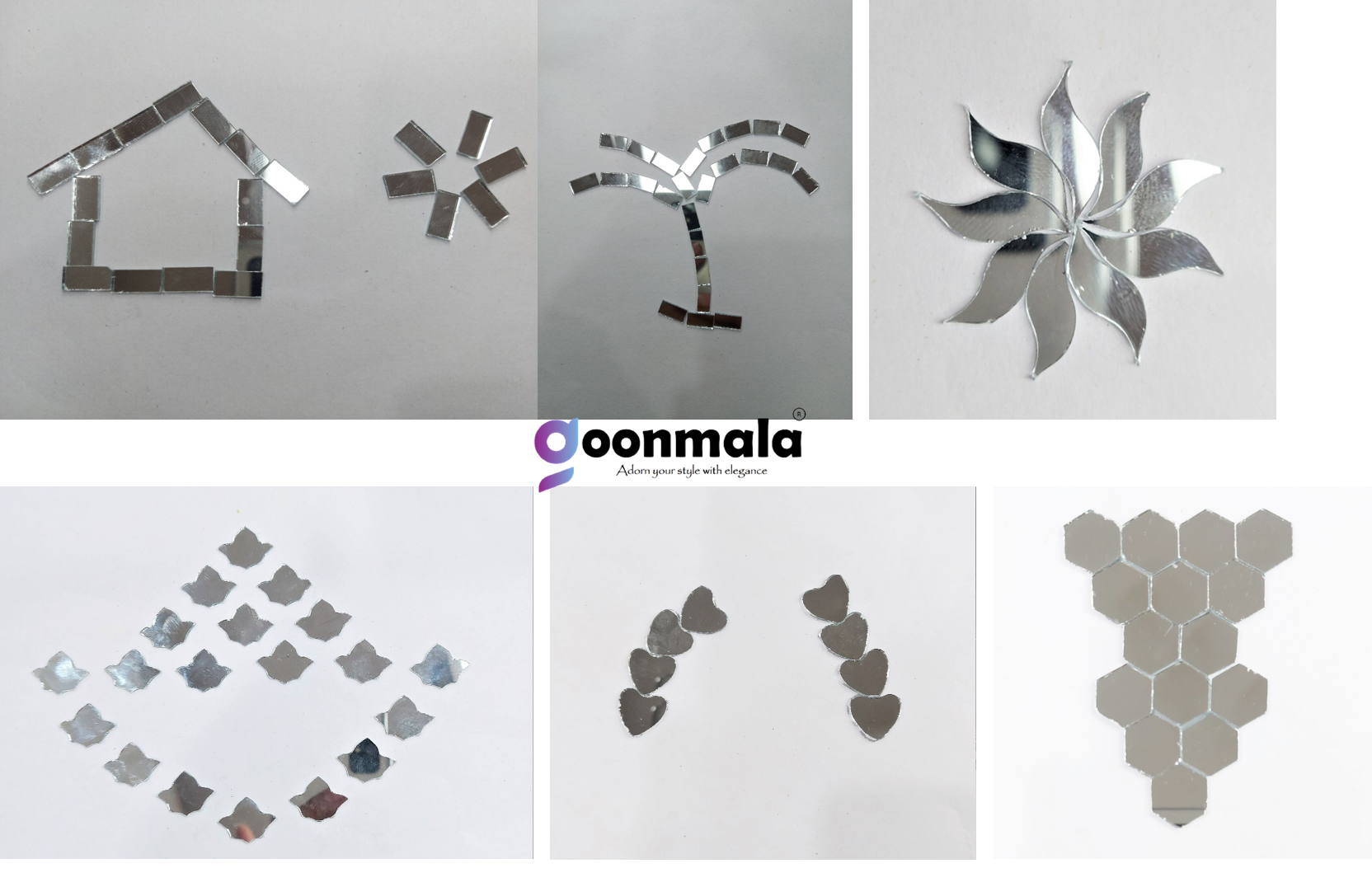 Mirror beads in designer shapes for jewellery making lippan art and other art and craft work. Goonmala provide extra pieces for in case of damages, each pieces manually selected. Colour: Silver,6 shape Unique Mirror- S-Leaf 22x8mm, Deepak 20mm, Hexa 13mm, Rectangular 5x10mm, Capsule 18x8mm, Half circle 14mm, 100pieces each Total 600 pieces with Fabric Glue